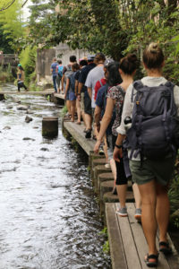 In the ‘60s this river was unrecognizable from what we see today and from what was seen before the area was overrun by factories flocking to the pure Fuji spring water (Ground Work Mishima, 8/10/2017). The surrounding areas dumped garbage into the stream and drainage was discharged directly into the waterway. In the ‘90s, Gembugawa was given a new life by the organization Ground Work, which rallied the community to rehabilitate the space. Not only did they clean up the river, but they transformed it into a usable and welcoming space. Physically, they didn’t change much. They cleaned up trash, added some access points to the river, and made a path along the water. But this transformed the space. The river became a park, a busy corridor through the heat and bustle of the city. The walkway bustles with dogwalkers and others, just out for a stroll. Children play in the stream – and so do adults.