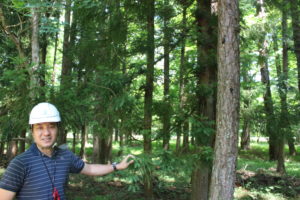 I’ve had run-ins with the uncontrolled wilderness here. I’ve encountered boars, foxes, a Japanese serow, and even a bear. They’ve been the highlights of that trip that I write about in my post cards. Yet, Haruo Saito from the Fuji Iyashinomori Woodland Center voiced concern at the increased sightings of bears in the area. He went on to describe a problem, though it took me quite a while to understand just exactly what the problem was. He claimed the under use of forest in the area has created safety and economic hazards, while also appearing messy and aesthetically unappealing as plants compete for light in the tightly packed plantation forests. 40% of Japan’s plantation forests are falling into disuse and abandonment. Wilderness is encroaching. From my American perspective, I would just assume this land will eventually be reclaimed by a more “natural” forest ecosystem, and that’s good or neutral. However, the economy in this area which once relied on forestry must now turn to other means. The center’s research addresses this concern by creating “comfortable forests” through ecotourism programs. As Saito showed us some of the areas of forest they’re researching, we were required to wear hardhats because abandoned plantation forests tend to drop branches from their crowded canopies.
