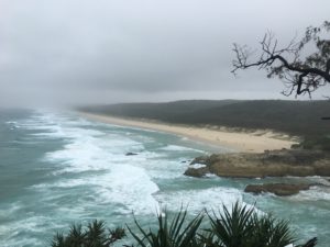 Today we left our cozy apartments in Brisbane and headed east for North Stradbroke Island. The island, which is a large tourist destination for many Australians, is a sand island across Moreton bay. To reach it, we took a short ferry ride and hopped off on the island, but it was no sunny beach day. First thing we did was walk the trail along the rocky headlands of the island. When we reached the point, we could see the rough seas below and hear the occasional pfuussshhhhh of the rocky blowhole. The rain started pouring down on us, and many of us realized our “waterproof rain jackets” weren’t so waterproof.